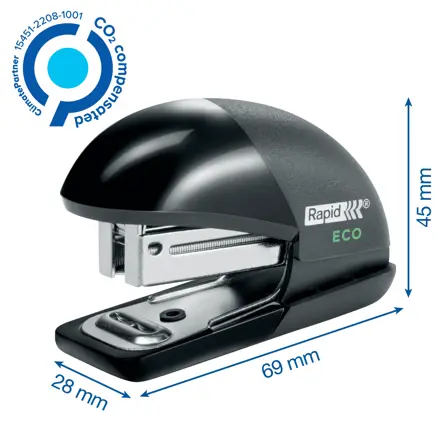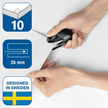 Mini hæftemaskine der hjælper med at holde orden i dit papirarbejde. Denne lille hæftemaskine er fremstillet af 95% recirkuleret plast og har en plastfri emballage, som er lavet af 100% recirkuleret pap med sojabaseret tryk. Den er kompakt og let, så den kan nemt passe i en håndtaske, computertaske eller endda i en lomme for at få en virkelig mobil løsning. Denne 100 % recirkulerbare hæftemaskine er designet til at hæfte op til 10 ark papir og er ideel til alle dine lette hæfteopgaver.