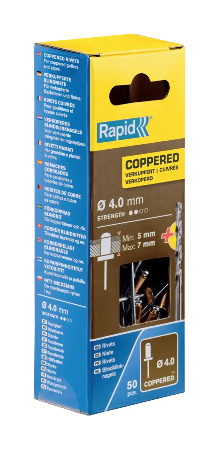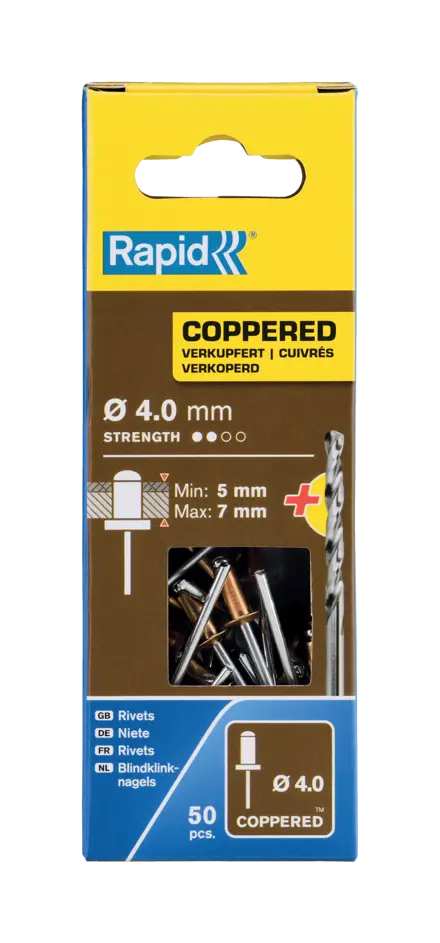 Forkobret blindnitte af højkvalitetsaluminium. Perfekt til effektiv og diskret sammenføjning af kobbermateriale såsom tagrender og kobberrør. Der medfølger et bor i den rigtige størrelse for at sikre den rette huldiameter.