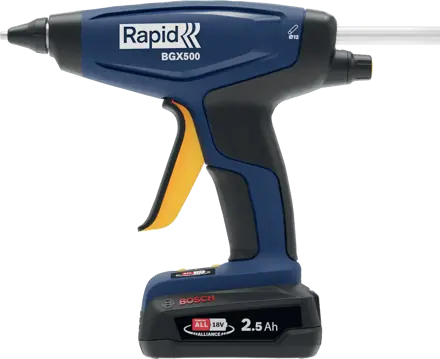 Akkubetriebene Heißklebepistole mit einem sehr guten Kleberdurchsatz. Mit der BGX500 lassen sich z. B. Kabel fixieren und Dekorationen herstellen. Ob für Designer, Installationstechniker oder für ambitionierte Heimwerker: dieses Gerät gehört einfach in jeden Werkzeugkasten. Die Rapid BGX500 ist gut ausbalanciert und hat einen 4-Finger-Abzughebel, mit dem es sich auch bei intensiver Nutzung bequem arbeiten lässt. Sie verfügt außerdem über eine einzigartige Hubverstellung zur Einstellung der richtigen Klebermenge pro Hebelbetätigung. Auswechselbare Düsen ermöglichen präzises Arbeiten und eine breite Palette von Anwendungsbereichen. Dank der schnellen Aufheizzeit des Schmelzklebers (3 Minuten), einer Anzeige, die anzeigt, wann der Klebstoff auftragsbereit ist, und einer LED-Anzeige für den Ladestatus des Akkus lässt sich mit der BGX500 schnell und effizient arbeiten. Lieferung in einem handlichen und schützenden Aufbewahrungs- und Transportkoffer, der einen 2,5Ah P4A Akku und ein P4A 18V-20 Ladegerät enthält. Ebenfalls enthalten ist eine Schnellstartanleitung, die dabei hilft, das Gerät richtig zu benutzen und den richtigen Kleber zu finden, wenn es Zeit zum Nachfüllen ist. Auch ein Startset mit 4 langen Universalklebesticks ist im Koffer enthalten. Rapid BGX500 ist Teil der Bosch POWER FOR ALL Akku-Allianz. Daher kann der Akku der Rapid 18V Geräte auch mit einer Vielzahl von Produkten von Marken wie Bosch, Gardena, Gloria und Wagner verwendet werden. Wir empfehlen den Bosch P4A 2,5 Ah Akku, der eine Betriebszeit von bis zu 2,5 Stunden ermöglicht.