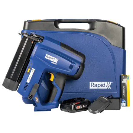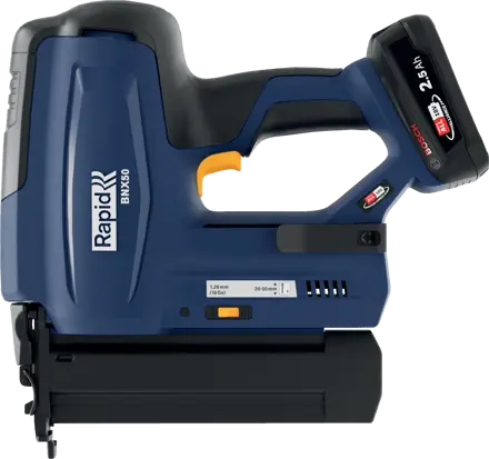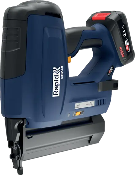 Der Rapid BNX50 ist ein effizienter und benutzerfreundlicher Nagler für die Befestigung von z.B. Zierleisten, Verkleidungen oder Sockelleisten. Bestückt mit dem Rapid 18Ga Stauchkopfnagel Typ 8, von 20 mm bis 50 mm, ist er ein vielseitiges Werkzeug, z.B. für die Hausrenovierung. Da er akkubetrieben ist, gibt es keine Stromkabel, sperrigen Gasbehälter oder Pneumatikschläuche, die die Mobilität und Zugänglichkeit einschränken könnten. Das Stellrad für die Nageltiefeneinstellung erleichtert das Arbeiten mit verschiedenen Nagellängen für unterschiedliche Anwendungen. Der Rapid BNX50 verfügt außerdem über zwei Auslösungsmodi: Einzel- oder Kontaktauslösung. Mit dem LED-Arbeitslicht lässt die gewünschte Präzision erreichen. Der BNX50 verfügt außerdem über praktische LED-Anzeigen, die den Ladezustand des Akkus anzeigen und ob der Nagler sich im Kontaktauslösungsmodus befindet. Wird in einem praktischen Aufbewahrungs- und Transportkoffer geliefert, der einen 2,5Ah P4A 18V Akku und ein P4A 18V-20 Ladegerät enthält. Im Lieferumfang enthalten ist auch eine Schnellstartanleitung, die dabei hilft, das Werkzeug richtig zu benutzen und die richtigen Nägel zu finden, wenn es Zeit zum Nachladen ist. Ein Startset mit 300 Stück 30 mm langen Nägeln ist ebenfalls im Koffer enthalten. Der Rapid BNX50 ist Teil der Bosch POWER FOR ALL Akku-Allianz. Daher kann der Akku der Rapid 18V Geräte auch mit einer Vielzahl von Produkten von Marken wie Bosch, Gardena, Gloria und Wagner verwendet werden. Wir empfehlen den P4A-Akku mit 2,5 Ah, mit dem sich pro Ladung bis zu 600 Nägel verarbeiten lassen.