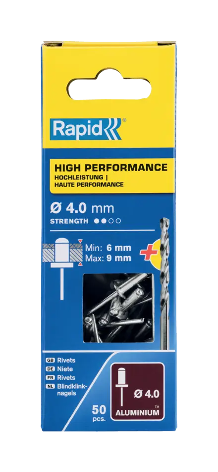 Diese hochwertigen Niete aus Aluminium sind perfekt zur Befestigung von Teilen an exponierten Stellen wie z. B. Schutzblechen, Metall- und Kunststoffverkleidungen, Schildern und Blechen. Ein passender Bohrer ist in der Verpackung enthalten.