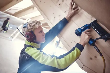 Der PBS151 ist ein professioneller Drucklufttacker und -nagler, der kraftvoll, präzise und vielseitig arbeitet. Mit ihm lassen sich Schmalrückenklammern und Nägel verarbeiten. Er ist ideal für schnelles Arbeiten im Innenausbau, Möbelbau, bei Abschlussarbeiten und Zierleisten uvm. Er hat eine 360° verstellbare Abluftblende, die Staub auf den Werkstücken verhindert. Zusätzlich hat der PBS151 ein Schnellladesystem und einen Komfortgriff für geringere Ermüdungserscheinungen. Er verarbeitet Schmalrückenklammern bis zu 40 mm und Nägel bis zu 50 mm Länge. Er wird in einem praktischen Aufbewahrungs- und Transportkoffer geliefert. Der Koffer enthält eine Kurzanleitung zur richtigen Verwendung des Werkzeugs und zur Wahl der richtigen Klammer oder des richtigen Nagels, wenn es Zeit für Nachschub ist. Außerdem sind 4 Kupplungen sowie eine Erstausstattung mit 200 Klammern und 200 Nägeln im Lieferumfang enthalten.