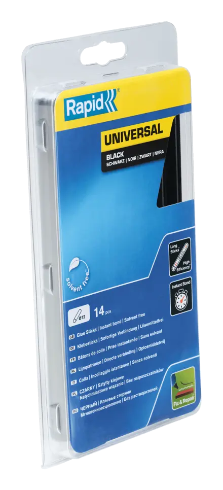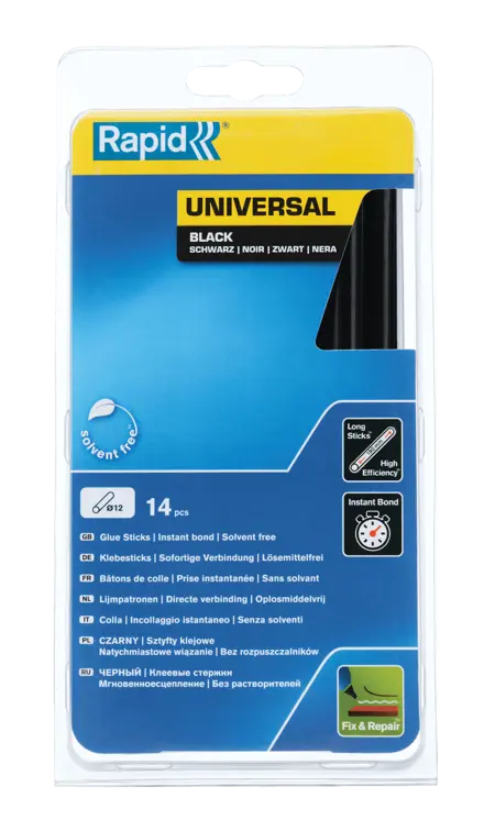 Diese schwarzen 12 mm Universal-Klebesticks sorgen wegen ihres hohen Harzgehaltes für eine starke Haftung. Perfekt für eine Vielzahl von Anwendungen wie z. B. mit Holz, Leder, Gewebe, Kork, Kunststoffen, Fayencen und Pappe, bei denen ein schwarzer Kleber zweckmäßig ist.