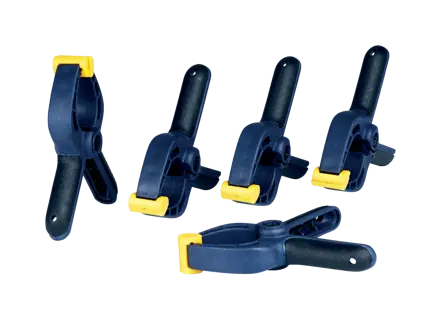 Dieses Set enthält 5 Mini-Federzwingen zum sicheren Fixieren beim Kleben oder Reparieren. Die gelbe Spannbackenoberfläche passt sich der Form des Objektes an, das gehalten werden soll, um so den bestmöglichen Halt zu gewährleisten, bis zu 35 mm. Mit ihren Griffen mit Softgrip sind diese starken, vielseitigen Zwingen ideal für vielfältige Anwendungen im Haus und bei Bastelarbeiten.