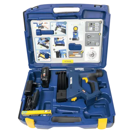 Mit dem Tacker BTX606 lassen sich mühelos Schränke montieren oder Verkleidungen und Leisten anbringen. Die akkubetriebene Rapid BTX606 ist für Anwender entwickelt, die einen leistungsstarken und praktischen Tacker für Schmalrückenklammern benötigen, ideal für Materialien wie Sperrholz Holzfaser- und Spanplatten. Der Tacker verarbeitet auch Rapid Stauchkopfnägel Typ 8, 15 - 30 mm, für Arbeiten, für die Nägel besser geeignet sind, wie z. B. Abschlussarbeiten. Eine einstellbare Schlagkraft mit sechs Einstellungen erleichtert die Arbeit mit verschiedenen Klammer- und Nagellängen und unterschiedlichen Materialien. Mit dem LED-Arbeitslicht lässt die gewünschte Präzision erreichen. Der BTX606 verfügt außerdem über eine praktische LED-Anzeige, die den Ladezustand des Akkus anzeigt. Wird in einem praktischen Aufbewahrungs- und Transportkoffer geliefert, der einen 2,5Ah P4A 18V Akku und ein P4A 18V-20 Ladegerät enthält. Im Lieferumfang enthalten ist auch eine Schnellstartanleitung, die dabei hilft, das Gerät richtig zu benutzen und die richtigen Verbrauchsmaterialien zu finden, wenn es Zeit zum Nachfüllen ist. Ein Startset mit 200 Stück 25 mm langen Klammern und 200 Stück 25 mm langen Nägeln ist ebenfalls im Koffer enthalten. Der Rapid BTX606 ist Teil der Bosch POWER FOR ALL Akku-Allianz. Daher kann der Akku der Rapid 18V Geräte auch mit einer Vielzahl von Produkten von Marken wie Bosch, Gardena, Gloria und Wagner verwendet werden. Wir empfehlen den P4A-Akku mit 2,5 Ah, mit dem sich pro Ladung bis zu 2500 Klammern verarbeiten lassen.