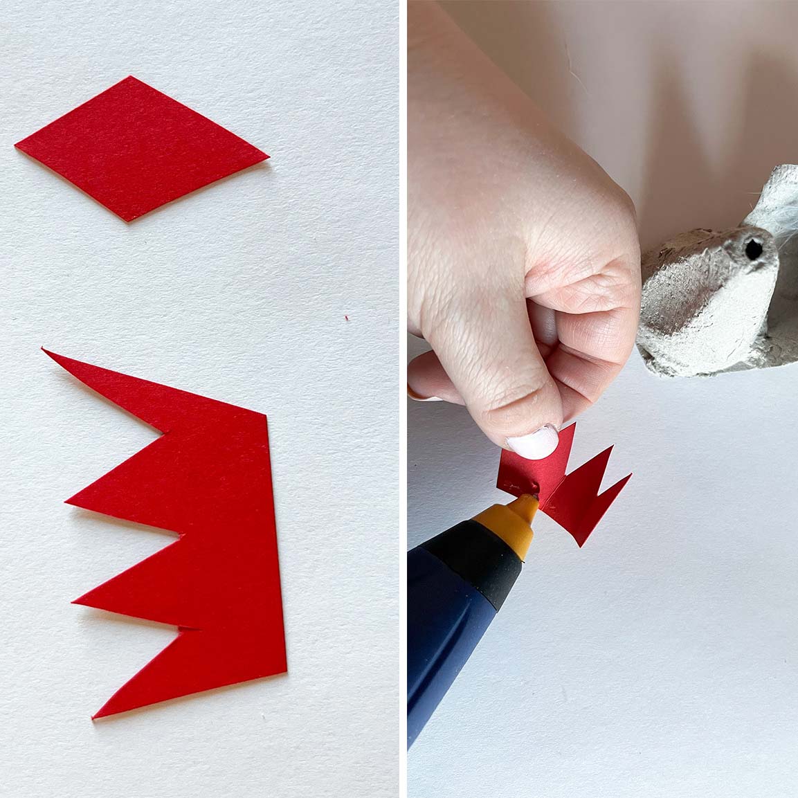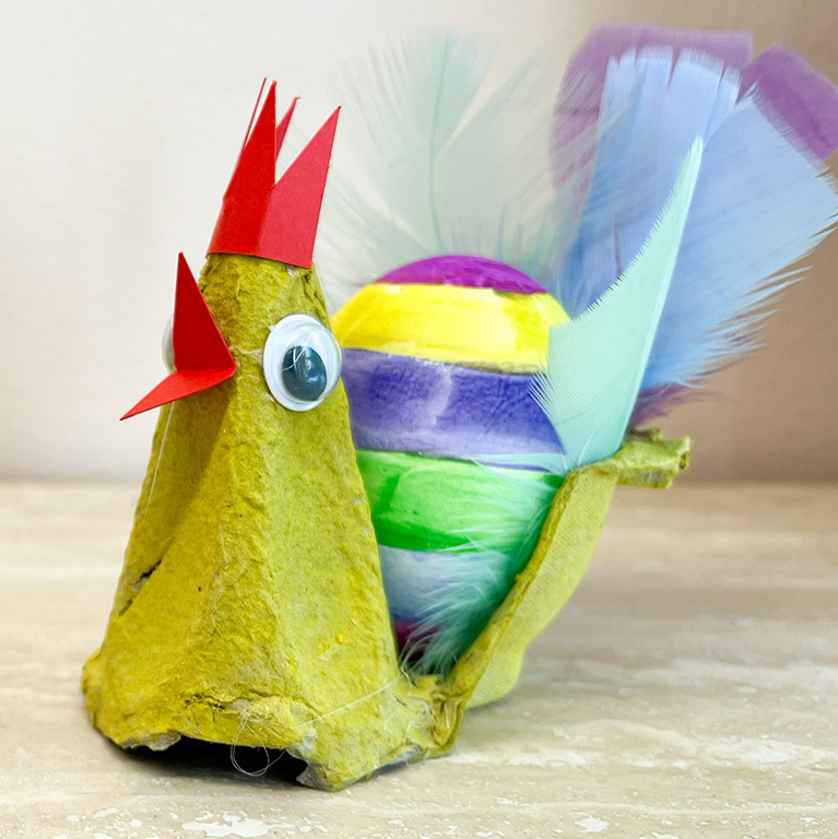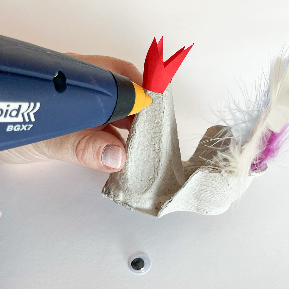Glue the comb around the pointed top of the carton piece to form the hen’s head.