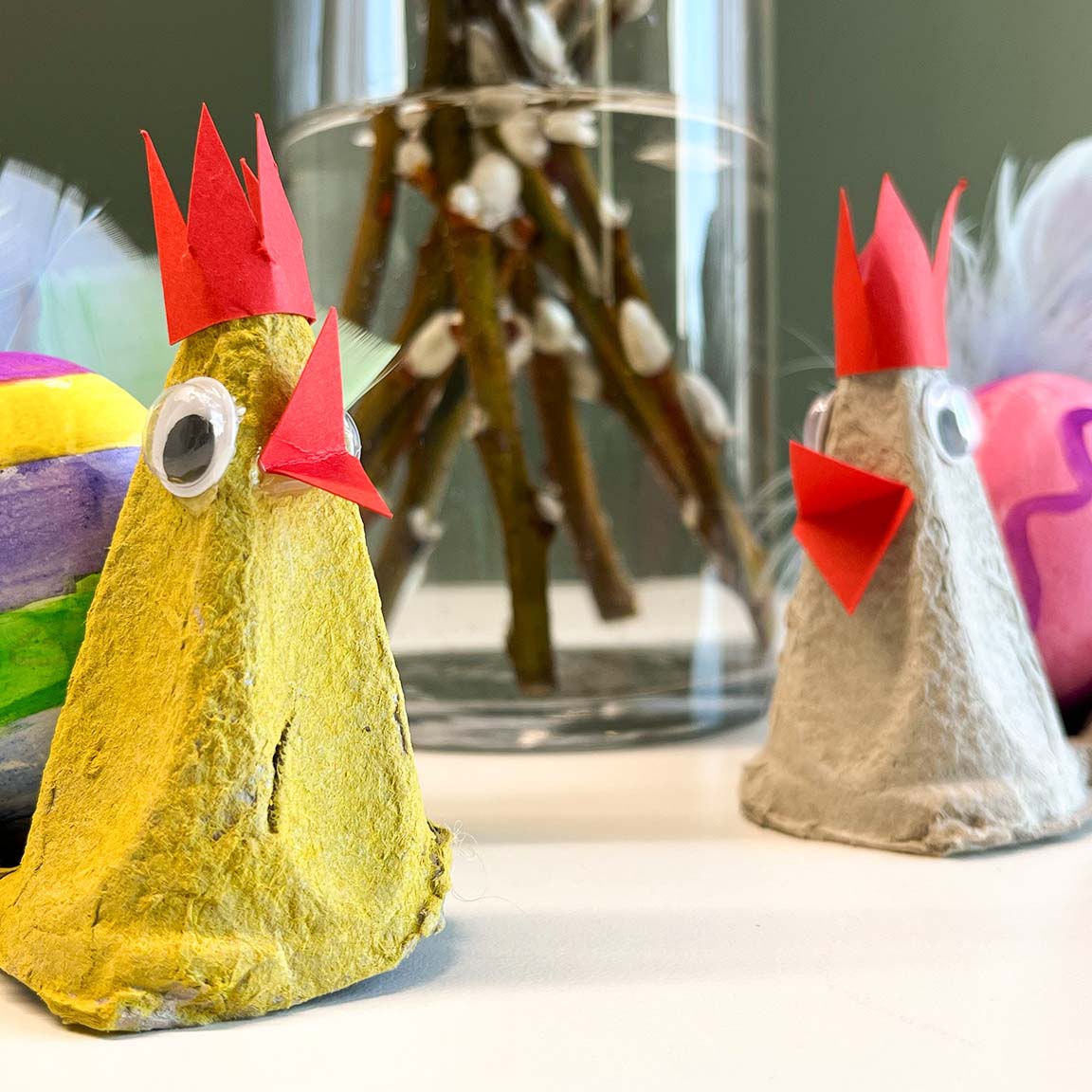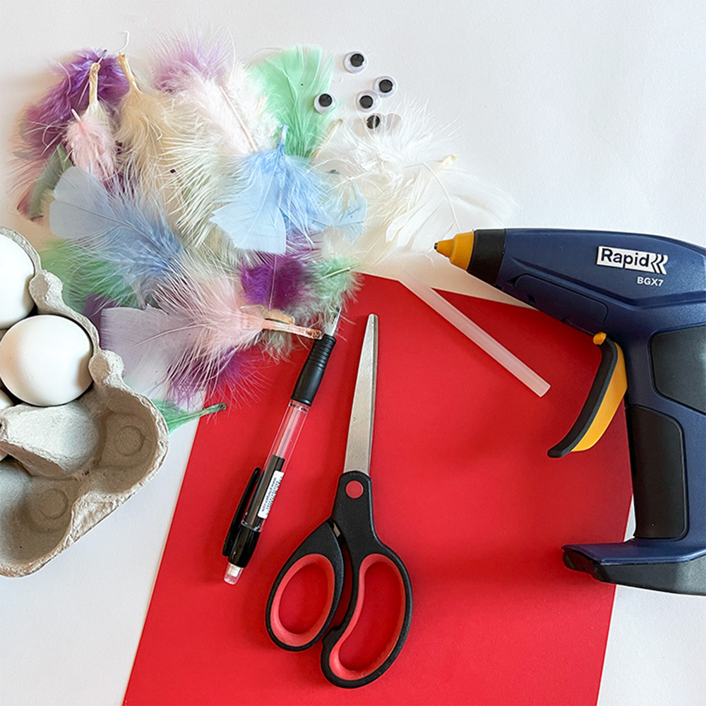 This DIY Easter craft is great for both adults and children. It is quick to make, low-mess and easy to personalize with paint, feathers and fun colors. A hot melt glue gun makes the project fast and neat, helping feathers, paper details and googly eyes stay securely in place.