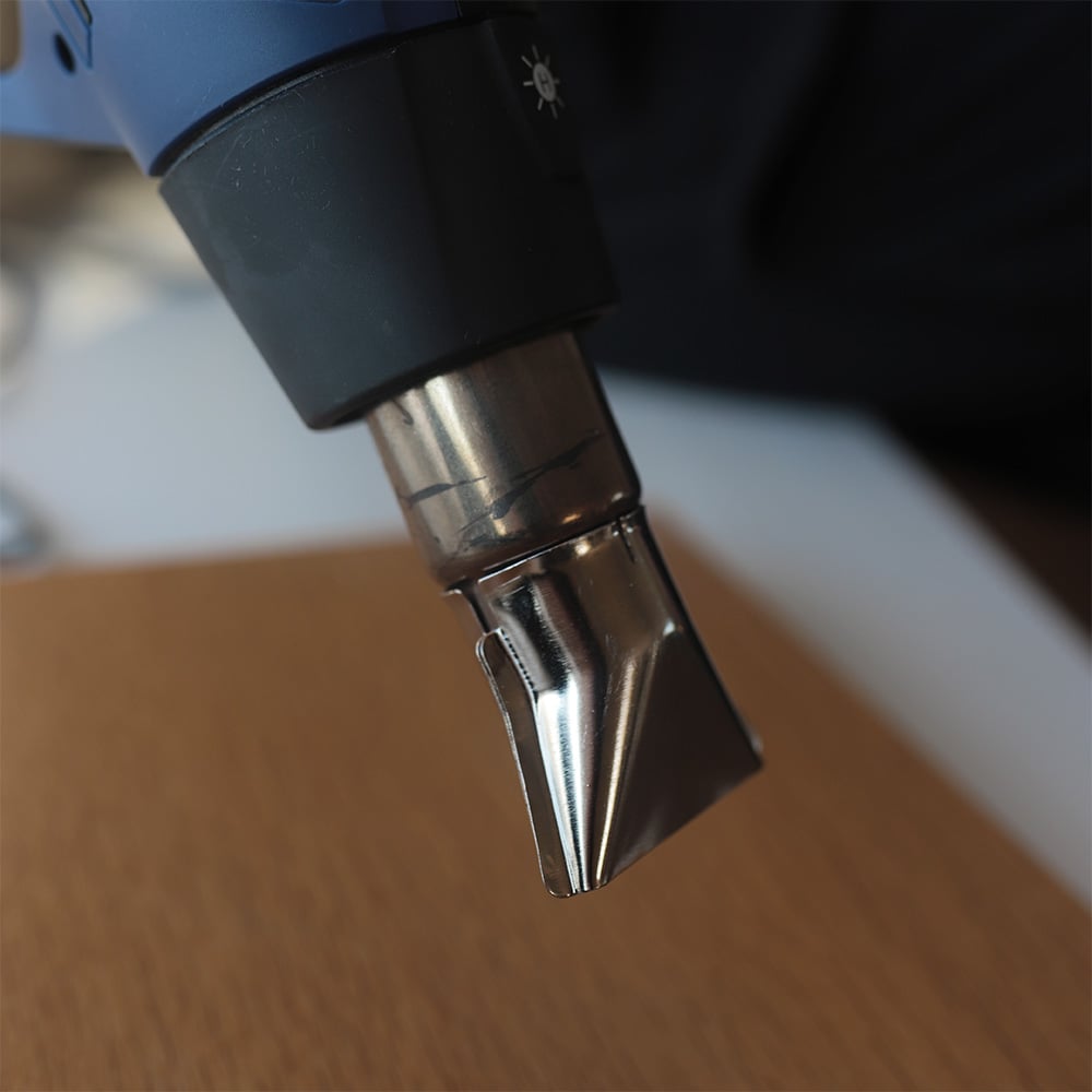 Keep the heat gun nozzle approximately 5 to 7 centimeters away from the surface. This distance provides enough thermal energy to soften the varnish without burning the underlying wood. It also depends on the varnish, always test on a small area and increase temperature setting and close the distance to see what works best.