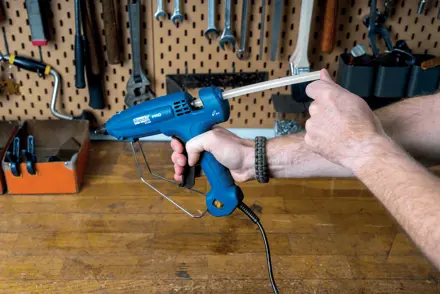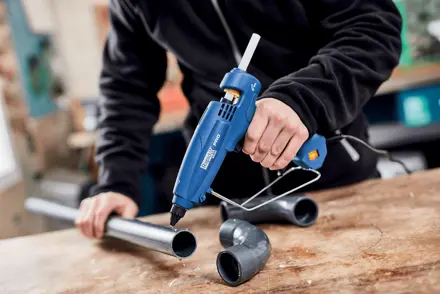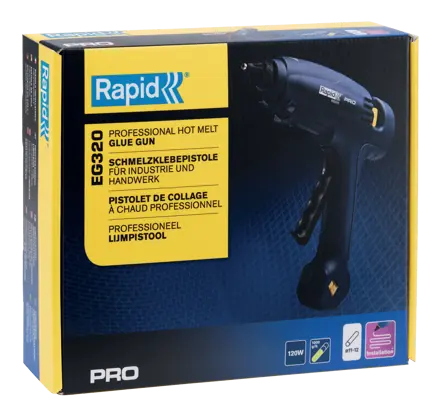 Professional, multi-purpose glue gun characterised by its compact size and light weight. Comfortable to operate, well balanced and designed for precision working even when working intensively, the EG320 is supplied with both stable and mobile stands for versatility and has a fast heating time and replaceable nozzle. Delivers 1000 g / hour glue output and features 195 °C self-regulated pre-set temperature control.