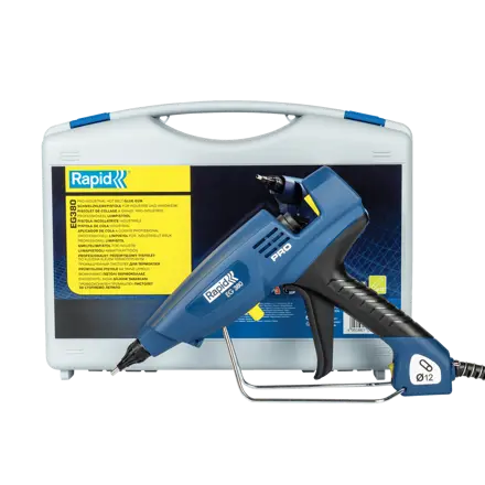 Professional, industrial performance glue gun with an exceptionally high glue output of 2200 g / hour. EG380 is designed for high frequency, demanding usage and precision application. Smart features include a handy, adjustable temperature control (120°-230 °C) for versatile application with different materials and an ergonomic 4-finger handle to reduce effort required. Works with both EVA and polyamide glue, has a 3.5 m rubber cable for optimal access and is supplied with a fixed and a mobile stand.
