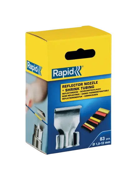 This handy reflector nozzle heats up all around the material by reflecting the hot airflow, providing uniform heating all around the pipe. This is particularly useful when soldering thin pipes, shaping PVC or shrinking shrink tubes. Comes in a set of 83 shrink tubings with diameters of 1,5 - 12 mm.