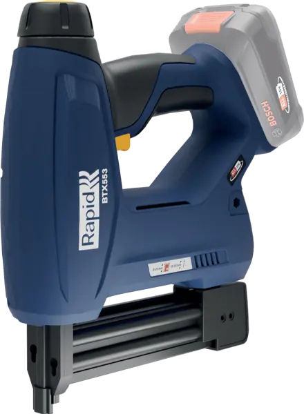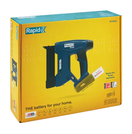 Powerful staple gun for staples and brad nails. One feature that makes the Rapid BTX553 stand out is its strength to fire standard staples from 8 mm to 20 mm. Finewire Rapid no. 53 staples are ideal for fastening materials such as textile, leather, wood, plastic, cardboard, rubber and synthetic fabric. The staple gun can also be loaded with Rapid brad nails no. 8, 15–20 mm, for work where brad nails are more suitable, such as trimming. An adjustable driving force with six settings makes it easy to work with different staple and brad nail lengths and various materials. With LED front lighting, you can achieve the desired precision. The BTX553 also has a practical LED indicator that shows the battery’s charge status. Rapid BTX553 is part of Bosch’s battery partnership, POWER FOR ALL ALLIANCE. So you can use the same battery with Rapid’s 18V products as with a number of products from brands like Bosch, Gardena, Gloria and Wagner. We recommend the P4A 2.5 Ah battery, which fires up to 2500 staples per charge. 2 strips of 10 mm staples are included. Battery and charger not included, but sold separately.