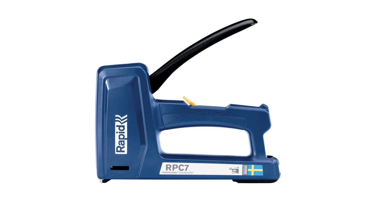 The RPC7 can be loaded with finewire, flatwire and cable staples, brad nails, and pins. The application areas for this staple gun are therefore extremely numerous: furniture upholstery, thin wood materials, Masonite, moisture and vapour barriers, plastic sheeting, low voltage cables, stapling of fine and thin textile materials, and work in the garden, such as the children’s rabbit hutch, and much more. Rapid's unique Powercurve® Technology reduces the force required to staple by up to 50%. This makes the RPC7 the right tool for whatever you turn your hand to - comfortable, fast, and easy to work with compared to traditional staple guns. The 2-step force adjuster helps you optimise the power requirement depending on staple length and material. The ergonomic RPC7 is made in Sweden from impact-resistant ABS plastic, with working parts made of top-quality steel.