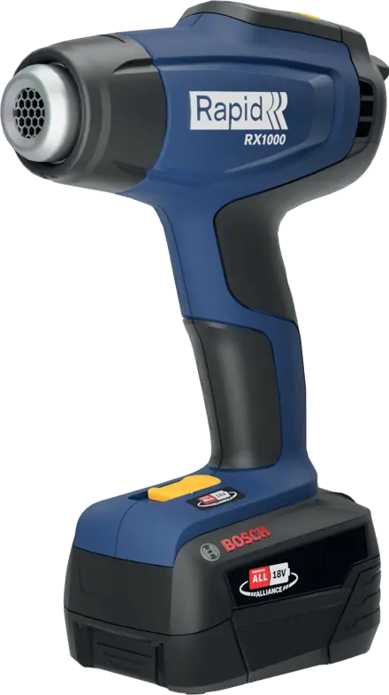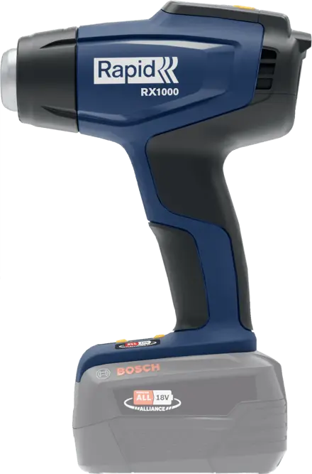 Una pistola de aire caliente inalámbrica que será de gran utilidad en el hogar para contraer tubos con calor, dar forma al plástico, descongelar tuberías de agua, despegar adhesivos, encerar tablas de snowboard y esquís o, por qué no, para eliminar malas hierbas del jardín. La pistola de aire caliente RX1000 de Rapid alcanza rápidamente hasta 550°C, lo que cubre la mayoría de los requisitos de estos proyectos. Con una pantalla LCD para regular la temperatura y el flujo de aire, también muestra el estado de carga de la batería. Una función única para retirar fácilmente las boquillas calientes sin quemarse proporciona mayor seguridad. Dos ajustes de flujo de aire que permiten trabajar con flexibilidad. Con una posición estable y sin sujeción, que permite tener las dos manos libres para trabajar. Rapid RX1000 forma parte de la asociación de baterías de Bosch, POWER FOR ALL ALLIANCE. Por lo tanto, se puede utilizar la misma batería con los productos de 18V de Rapid que con varios productos de marcas como Bosch, Gardena, Gloria y Wagner. Recomendamos la batería P4A 4.0 Ah, que proporciona hasta 22 minutos de tiempo de funcionamiento. La batería y el cargador no están incluidos, se venden por separado.