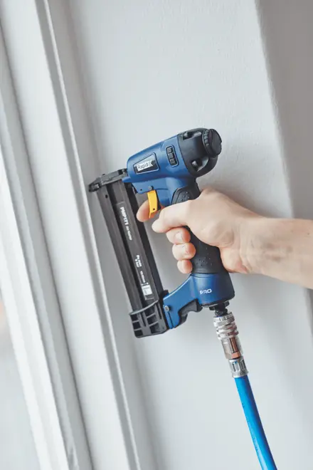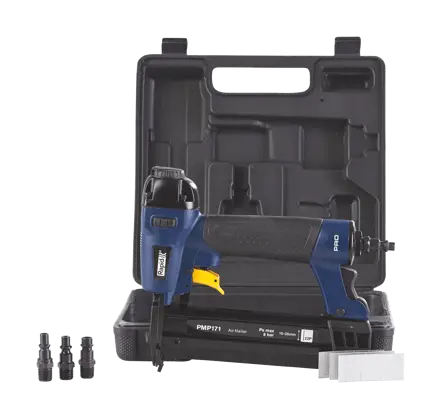 Para una carpintería de precisión con resultados prácticamente invisibles, la PMP171 es la clavadora micro-pinner neumática ideal para profesionales y usuarios exigentes de bricolaje. Dispara micro-pins de 23 Ga de hasta 35 mm, lo que la hace ideal para la sujeción de molduras finas, marcos de puertas y ventanas, decoración, zócalos y muebles. Sus características incluyen un sistema de carga lateral rápida, activación por contacto para una fijación segura y precisa y salida de aire ajustable a 360° que mantiene el polvo alejado de la superficie de trabajo. Estuche que incluye 4 adaptadores y un set de inicio de 500 pins.