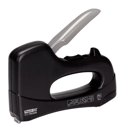Clavadora de cuatro funciones con cargador universal que carga grapas, grapas para cable, clavillos y agujas. Mecanismo completamente en acero.