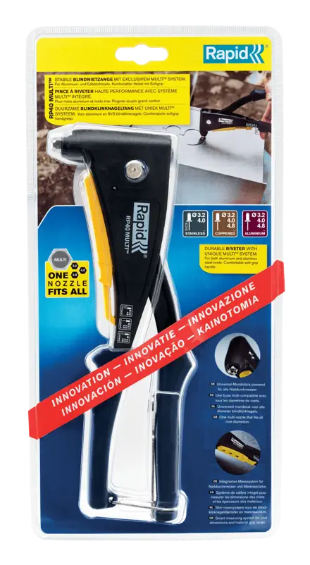 Disfrute de la eficacia de una única herramienta de remachado. Gracias a su exclusiva boquilla múltiple la remachadora RP40 Multi puede utilizarse sin cambiar de boquilla. Esto significa menos interrupciones y mejores resultados al trabajar con cualquier tipo de chapa metálica. La RP40 Multi cuenta con un calibrador inteligente que mide las dimensiones de los remaches y el grosor del material. Ahora podrá estar seguro de que está utilizando el remache correcto en el agujero correcto. Otras características que se incluyen: mango suave para un mayor comodidad al trabajar, mordaza de metal resistente para una mayor duración del producto y un elegante acabado en negro mate.