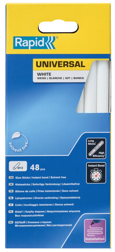Deze 12 mm lijmpatronen universeel wit zorgen voor een sterke verbinding dankzij de hoge harsniveaus. Uitermate geschikt voor toepassingen waar een witte afwerking gewenst is. De verpakking bevat 48 lange sticks, perfect voor installatiewerkzaamheden.