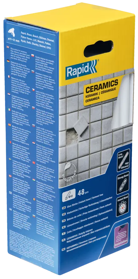 Deze 12 mm lijmpatronen zorgen voor een sterke verbinding dankzij de hoge harsniveaus. Perfect voor aardewerk, tegels, porcelein en andere poreuze materialen. Ook geschikt voor cement, beton en steen. De verpakking bevat 48 lange sticks, perfect voor installatiewerkzaamheden.