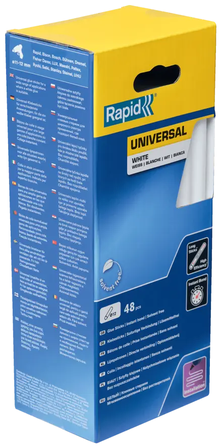 Deze 12 mm lijmpatronen universeel wit zorgen voor een sterke verbinding dankzij de hoge harsniveaus. Uitermate geschikt voor toepassingen waar een witte afwerking gewenst is. De verpakking bevat 48 lange sticks, perfect voor installatiewerkzaamheden.