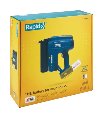 De Rapid BNX50 is een efficiënte en gebruiksvriendelijk nageltacker voor het plaatsen van bijvoorbeeld sierlijsten, panelen of plinten. Verwerkt Rapid's 18Ga brads nr. 8/20-50 mm. Een veelzijdige machine voor bijvoorbeeld woningrenovatie. Omdat hij op accu werkt, zijn er geen elektriciteitssnoeren, omslachtige gaspatronen of pneumatische slangen die de bewegingsvrijheid beperken. Deinstelbare inslagdiepte vergemakkelijkt het werken met verschillende lengtes brads voor diverse toepassingen. De Rapid BNX50 heeft twee standen: enkel schots of snelvuur. Precisie met LED licht aan de voorzijde. De BNX50 beschikt ook over praktische LED's die de laadstatus van de accu tonen en wanneer de tacker in snelvuurmodus staat. De Rapid BNX50 maakt deel uit van Bosch's POWER FOR ALL ALLIANCE (P4A). Hierbij is het mogelijk dezelfde accu te gebruiken voor 18V P4A producten van Rapid en merken als Bosch, Gardena, Gloria en Wagner. We raden de Bosch P4A 2,5 Ah accu aan, die tot 600 schoten per acculading geeft. Inclusief 200 stuks (2 strips) 30mm brads. Accu en oplader niet inbegrepen, apart verkrijgbaar.