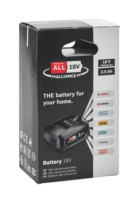 Met een capaciteit van 2,5 Ah houdt deze POWER FOR ALL 18V-accu elk gereedschap lang genoeg aan de gang om een breed scala aan grote klussen aan te pakken met één enkele lading. De perfecte balans tussen gewicht en werktijd. De Lithium-Ion-cellen in de accu kunnen snel worden opgeladen zonder geheugeneffect voor een lange levensduur van de accu. De accu is compatibel met alle 18V POWER FOR ALL ALLIANCE (P4A) producten van Rapid en merken als Bosch, Gardena, Gloria en Wagner. Dit betekent dat je niet langer voor elk product één accu dient aan te schaffen, je kunt eenvoudig van het ene naar het andere product overschakelen wanneer dat nodig is. Je bespaart geld en blijft te allen tijde flexibel! De accu is binnen 60 minuten tot 80% opgeladen en binnen 80 minuten volledig opgeladen met de P4A 18V-20 oplader.