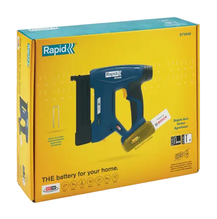 Met de BTX606 tacker kan je gemakkelijk garderobes en kasten in elkaar zetten of lambriseringen en sierlijsten aanbrengen. De Rapid BTX606 accutacker is voor gebruikers die een krachtige machine nodig hebben voor smalrugnieten, ideaal voor materialen als masoniet, multiplex en spaanplaat. Verwerkt ook Rapid nr. 8/15-30 mm brads, voor werkzaamheden zoals houtafwerking en panelen waarvoor brads geschikter zijn. De instelbare slagkracht met zes standen maakt het gemakkelijker om te werken met verschillende lengtes nieten en brads en diverse materialen. Precisie met LED licht aan de voorzijde. De BTX606 beschikt ook over een praktische LED-indicator die de laadstatus van de accu toont. De Rapid BTX606 maakt deel uit van Bosch's POWER FOR ALL ALLIANCE (P4A). Hierbij is het mogelijk dezelfde accu te gebruiken voor 18V P4A producten van Rapid en merken als Bosch, Gardena, Gloria en Wagner. We raden de Bosch P4A 2,5 Ah accu aan, die tot 2.500 schoten per acculading geeft. Inclusief 120 stuks (2 strips) 18mm smalrugnieten. Accu en oplader niet inbegrepen, apart verkrijgbaar.